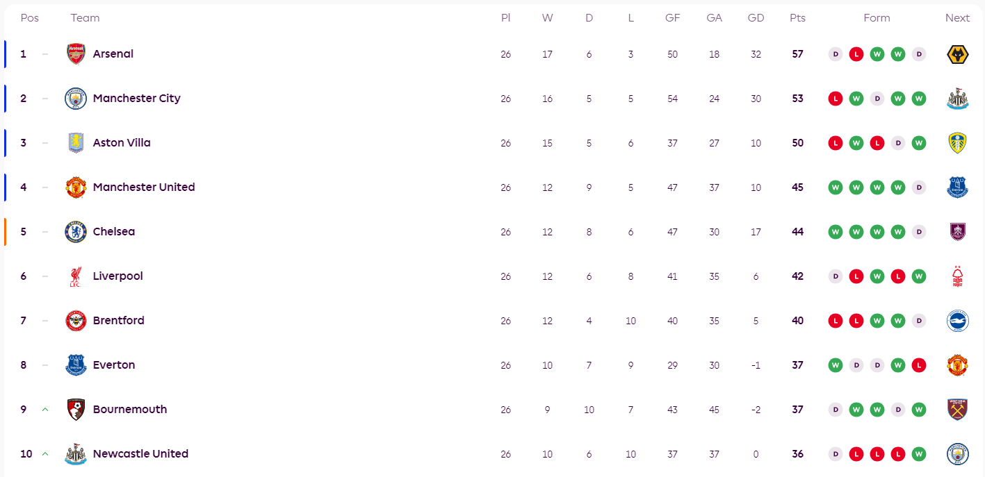 北京时间2月13日,2025-26赛季英超第26轮战罢,由于较前一比赛日仅多赛了1场,布伦特福德1-1战平阿森纳,因此对积分榜产生的影响较为微小: